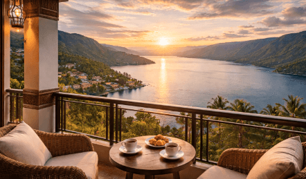 Balkon kamar sebuah hotel di Parapat dengan view danau yang menawarkan suasana tenang dan romantis saat matahari terbenam.