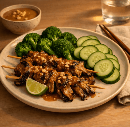 Seperempat Piring Protein: Masukkan 5 hingga 7 tusuk sate jamur sebagai sumber protein nabati utama.