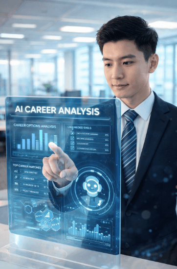 Seorang profesional muda menggunakan teknologi AI untuk merancang panduan karir 2026.