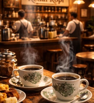 Suasana otentik kedai kopi di Medan yang menyajikan kopi khas Sumatera dengan aroma yang kuat