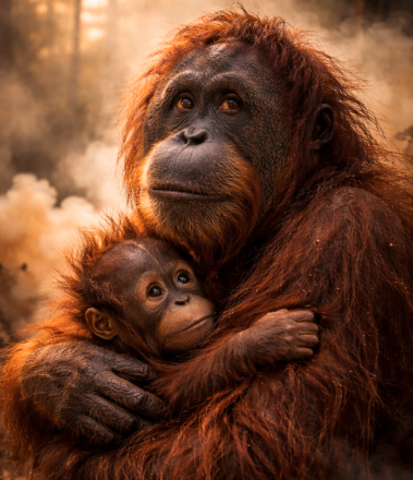 Dampak buruk kabut asap kebakaran hutan yang mengancam kesehatan pernapasan orangutan dan bayinya di alam liar.