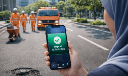 Seorang warga menggunakan fitur Pengaduan Waktu Nyata Medan untuk melaporkan kerusakan fasilitas umum di jalan raya pusat kota.