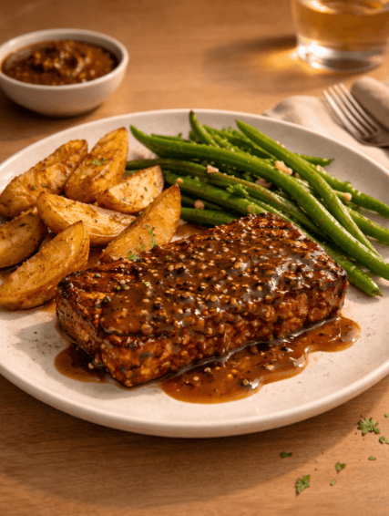 Siram Saus Lada Hitam: Tuangkan saus lada hitam kental di atas steak tempe yang masih panas membara.