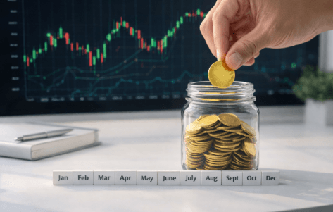 Ilustrasi teknik menabung rutin melalui strategi Dollar Cost Averaging guna membangun aset saham secara bertahap.
