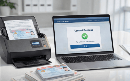 Proses pemindaian dokumen dan persiapan syarat berkas Loker BUMN Medan untuk pendaftaran online.