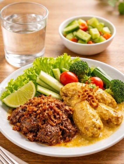 Jangan hanya fokus pada daging rendang saja. Sebaiknya, penuhi separuh piring Anda dengan sayuran hijau atau buah. Sebab, serat sangat ampuh untuk mengikat lemak jahat di usus. Selain itu, Anda bisa menambahkan acar timun segar. Rasa asamnya membantu menetralkan lemak jenuh dari santan opor.