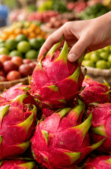 Buah Naga: Cari yang sisik kulitnya sudah mulai mengering dan warna merahnya merata hingga ke bagian ujung pangkal buahnya.
